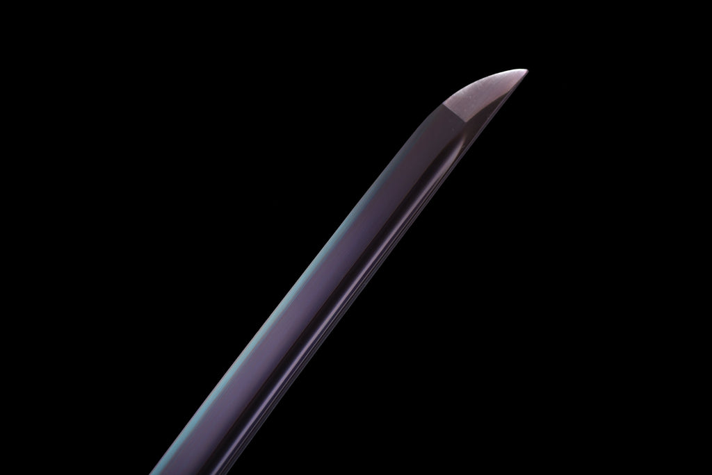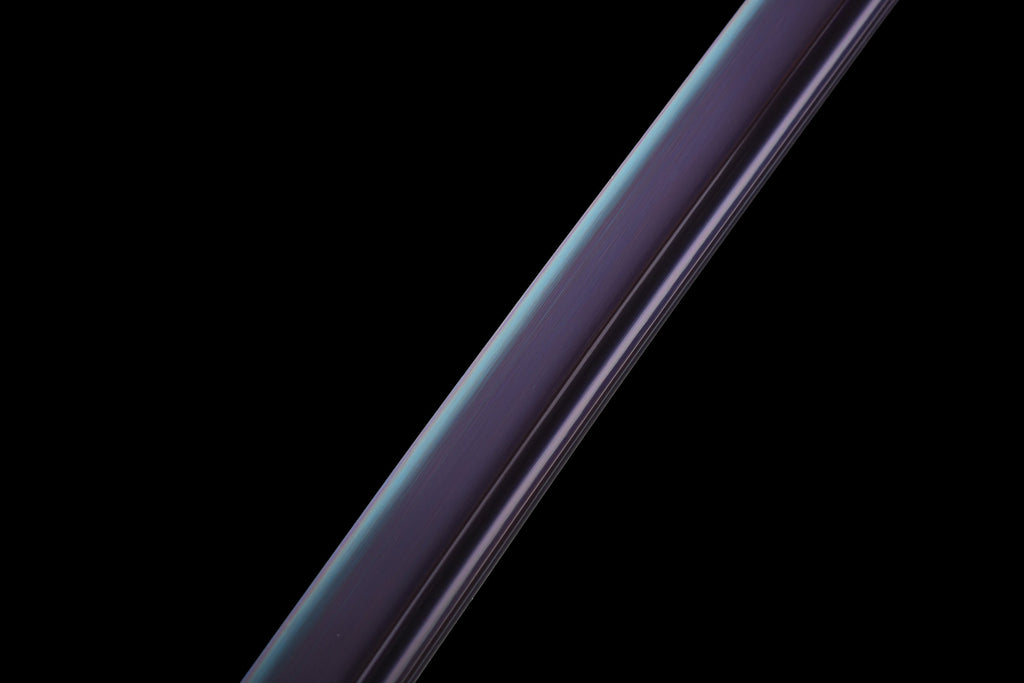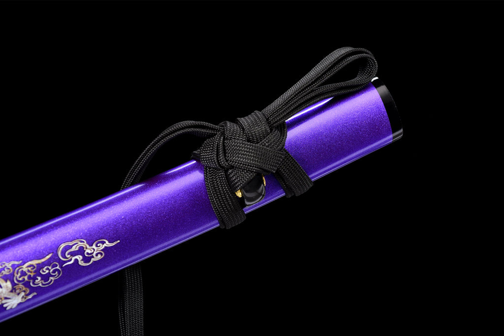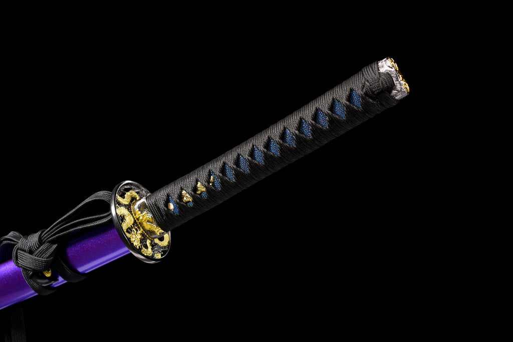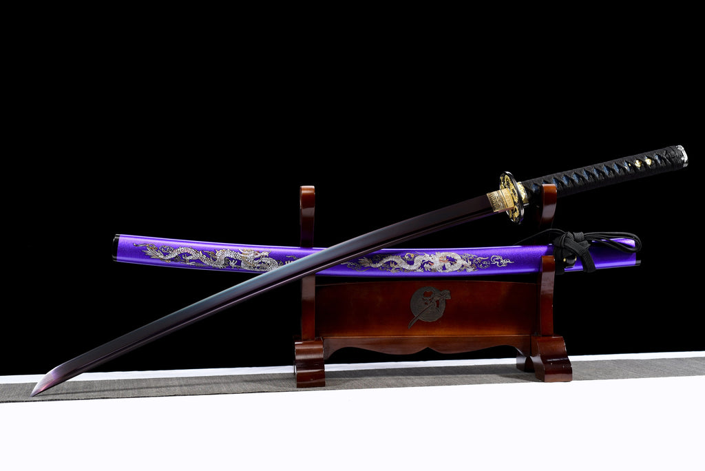 Deze katana is een opvallend stuk met een eigentijdse twist, dankzij het paarskleurige staal en de drakengravure.