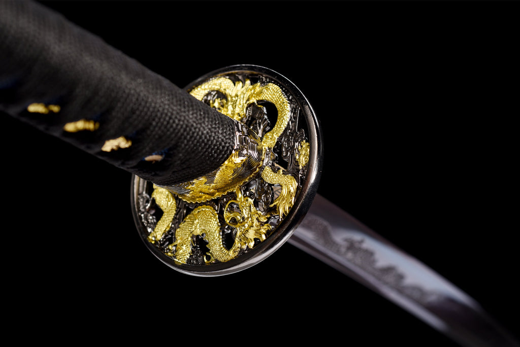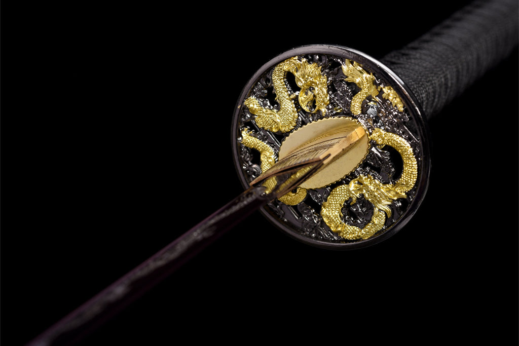 Tsuba (鍔): De Tsuba, gemaakt van zinklegering, is voorzien van complexe gravures die zowel functionele bescherming als een onderscheidend visueel element bieden, waardoor de identiteit van de katana wordt versterkt.