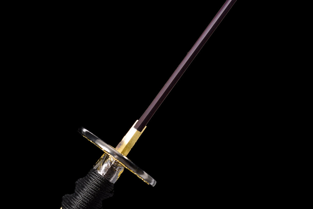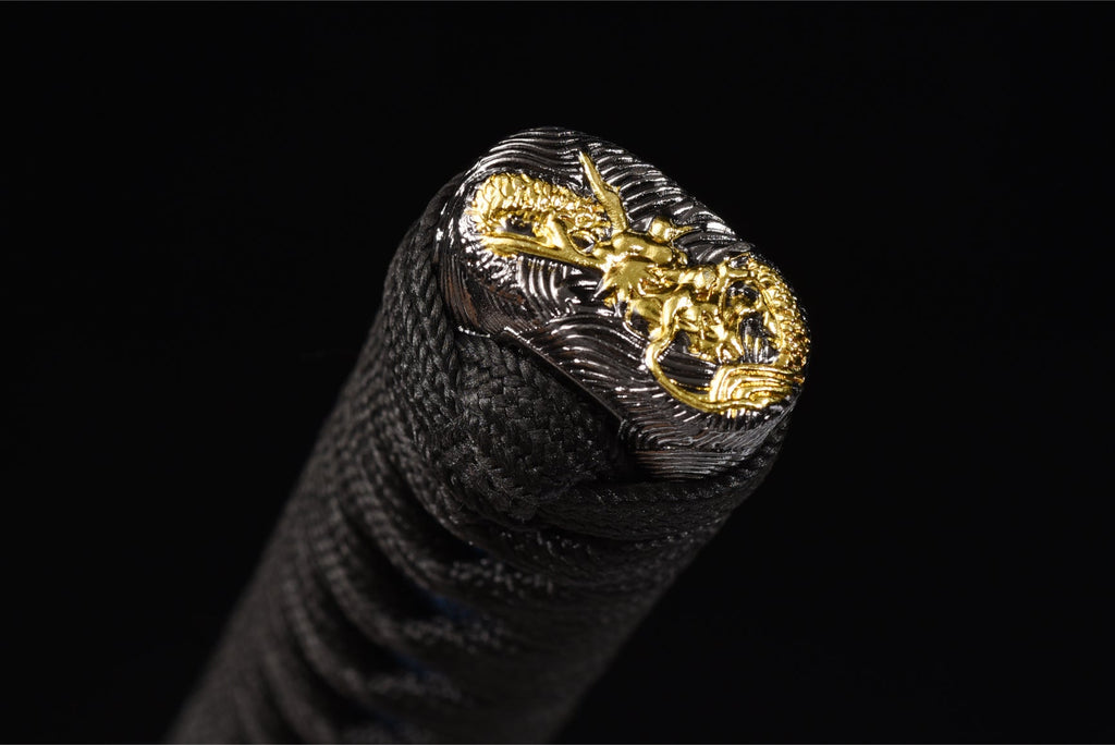 Lemmet (刀身): Het 1060-staal van het lemmet biedt een ideale balans tussen sterkte en snijvermogen, verrijkt met een onconventionele paarse tint. De drakengravure versterkt niet alleen de esthetiek, maar symboliseert ook kracht en wijsheid in de Japanse cultuur.