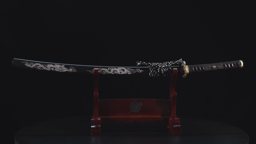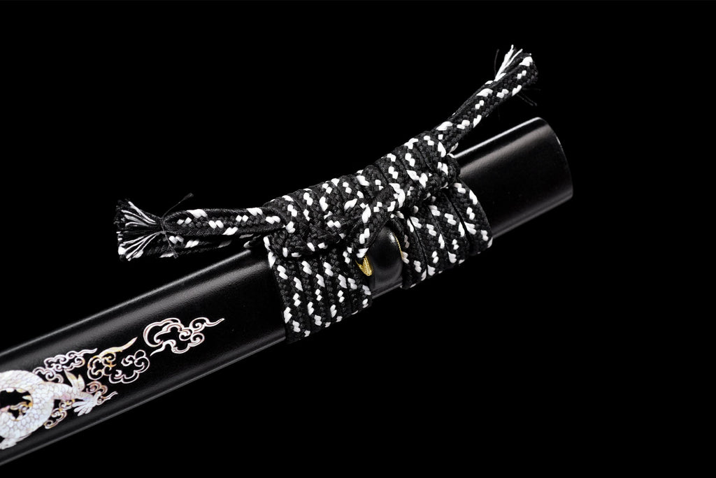 Saya: De zwart gelakte houten schede is versierd met zilveren drakenmotieven en biedt een elegante en verfijnde afwerking met gebeeldhouwde en ingelegde details die de adelstand en kracht van de draak benadrukken.