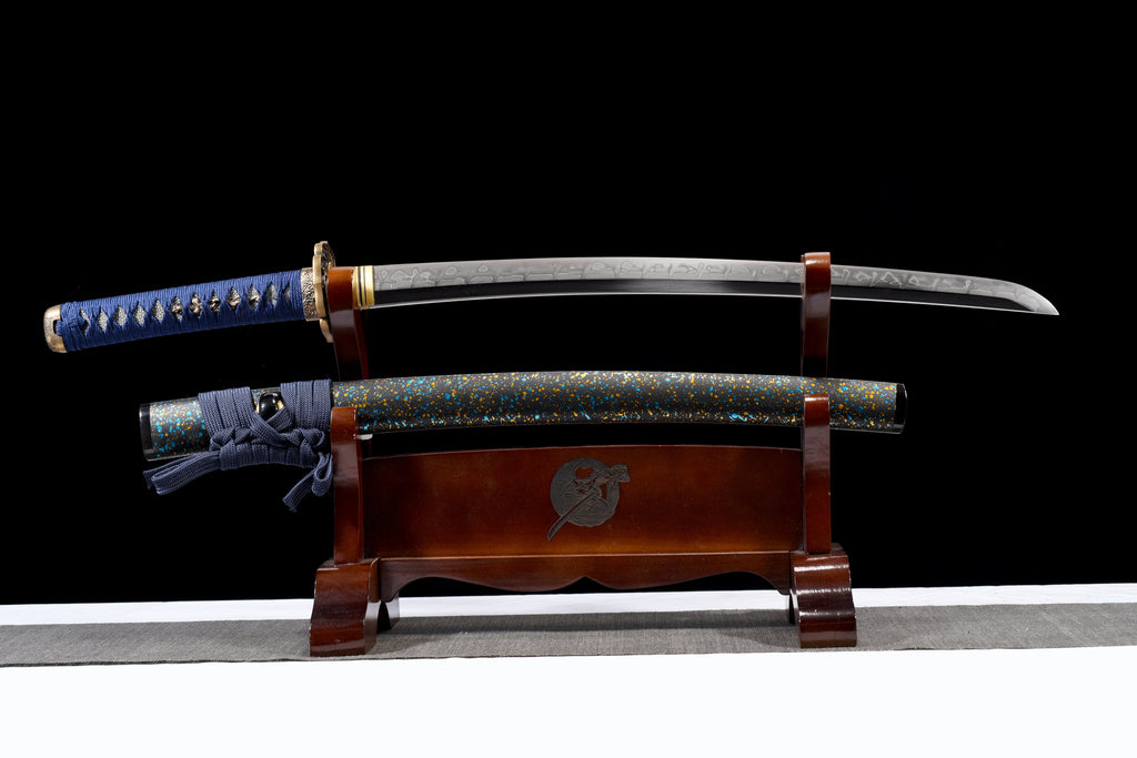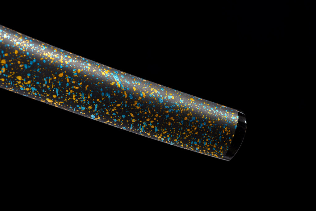 Schede (Saya 鞘) : Zwart gelakte saya met glinsterende blauwe en gouden spikkels, die doen denken aan een sterrenhemel.