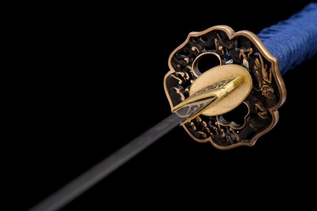 Greep (Tsuka 柄) : Gewikkeld in diepblauw koord over roggenhuid, met een kashira waarop een draak is gegraveerd, een symbool van kracht en bescherming.
